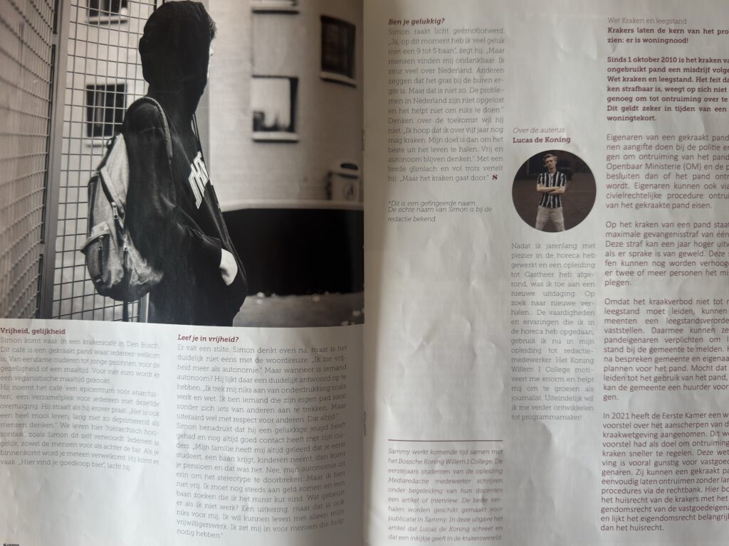Simon is vaak te vinden bij een krakerscafé in Den Bosch. Hij noemt het ‘’een epicentrum voor anarchisten’’. Simon bedoelt dat dit Café een verzamelplek is voor iedereen met dezelfde overtuigingen. En hij straalt als hij erover praat. ‘’Het is ook een heel mooi leven, Niet zo deprimerend als mensen denken’’.